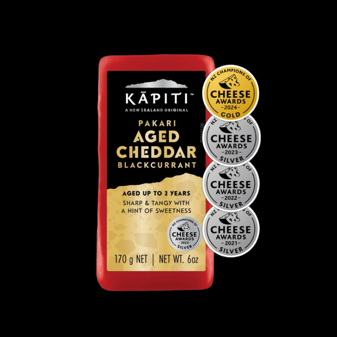In te reo Māori, Pakari speaks of maturity and strength - qualities shared by this cheese. Our Kāpiti Pakari Blackcurrant Aged Cheddar is a delicious blend of sweet and savoury. This tangy cheddar is aged for up to 2 years before being steeped in New Zealand blackcurrant for a hint of sweetness.
