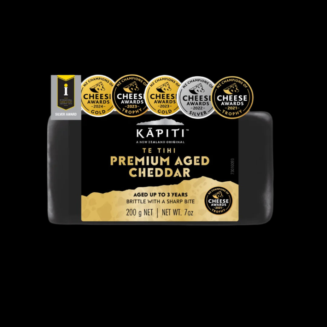 Kāpiti Te Tihi Premium Aged Cheddar has been aged up to three years, giving it a sharp, zesty bite and firm, crumbly body. Expect some lactate crystallisation that gives this cheese a sharp crunch. Te Tihi, meaning peak, point or summit in Māori, is befitting of our sharpest cheddar in the range and links to the iconic shape of this cheese.